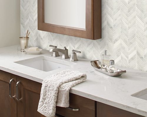 • Accent tiles that sparkle and shine, like jewelry that sets off a beautiful outfit; these tiles feature mosaic inserts of glass, metallics, and stone